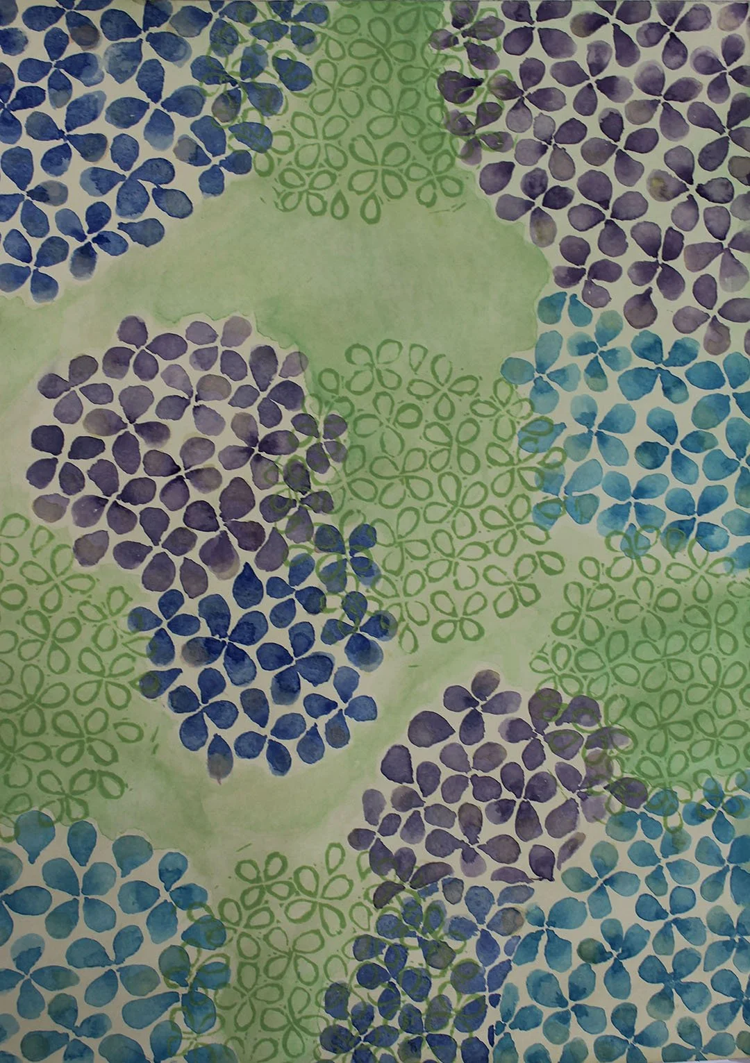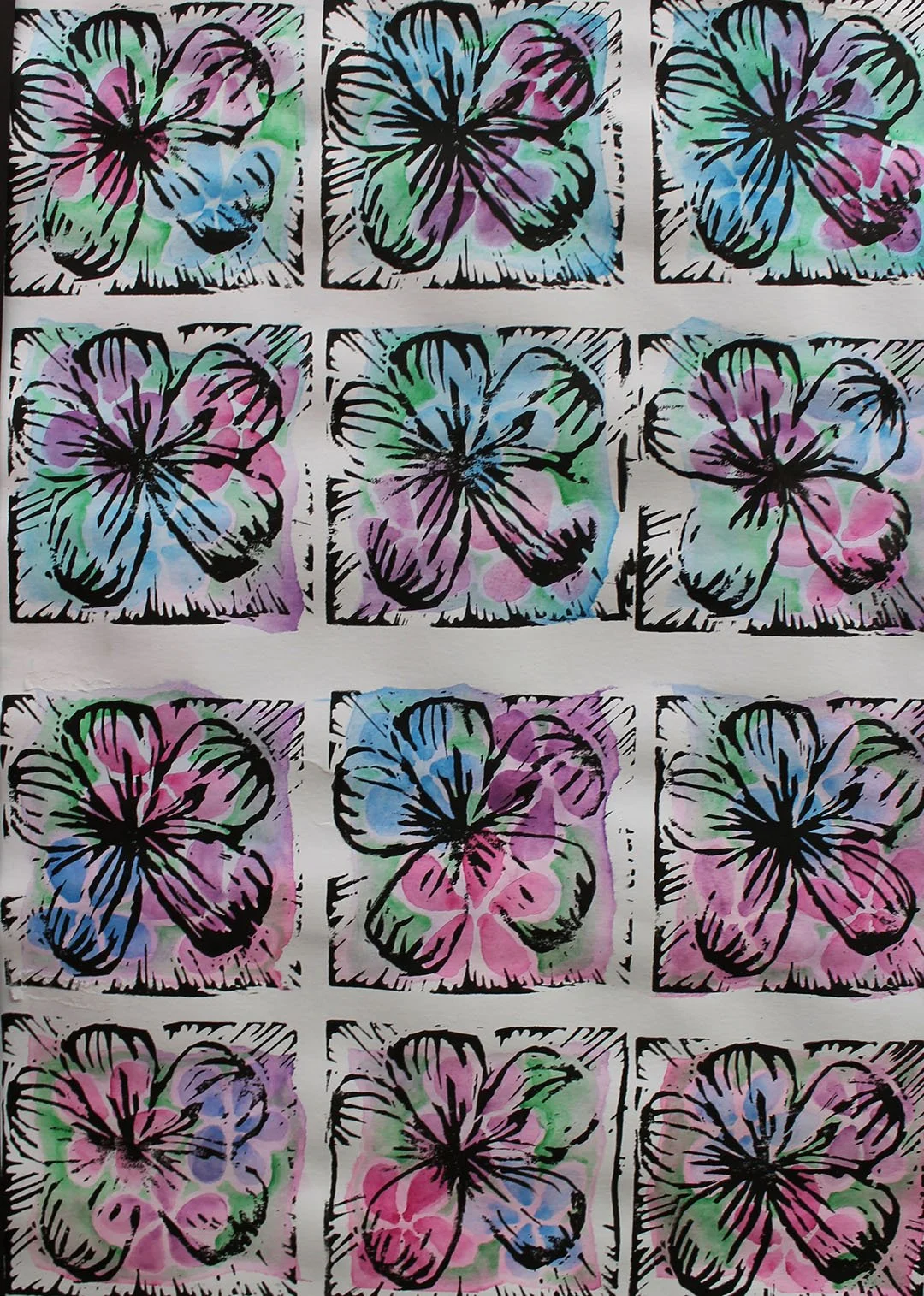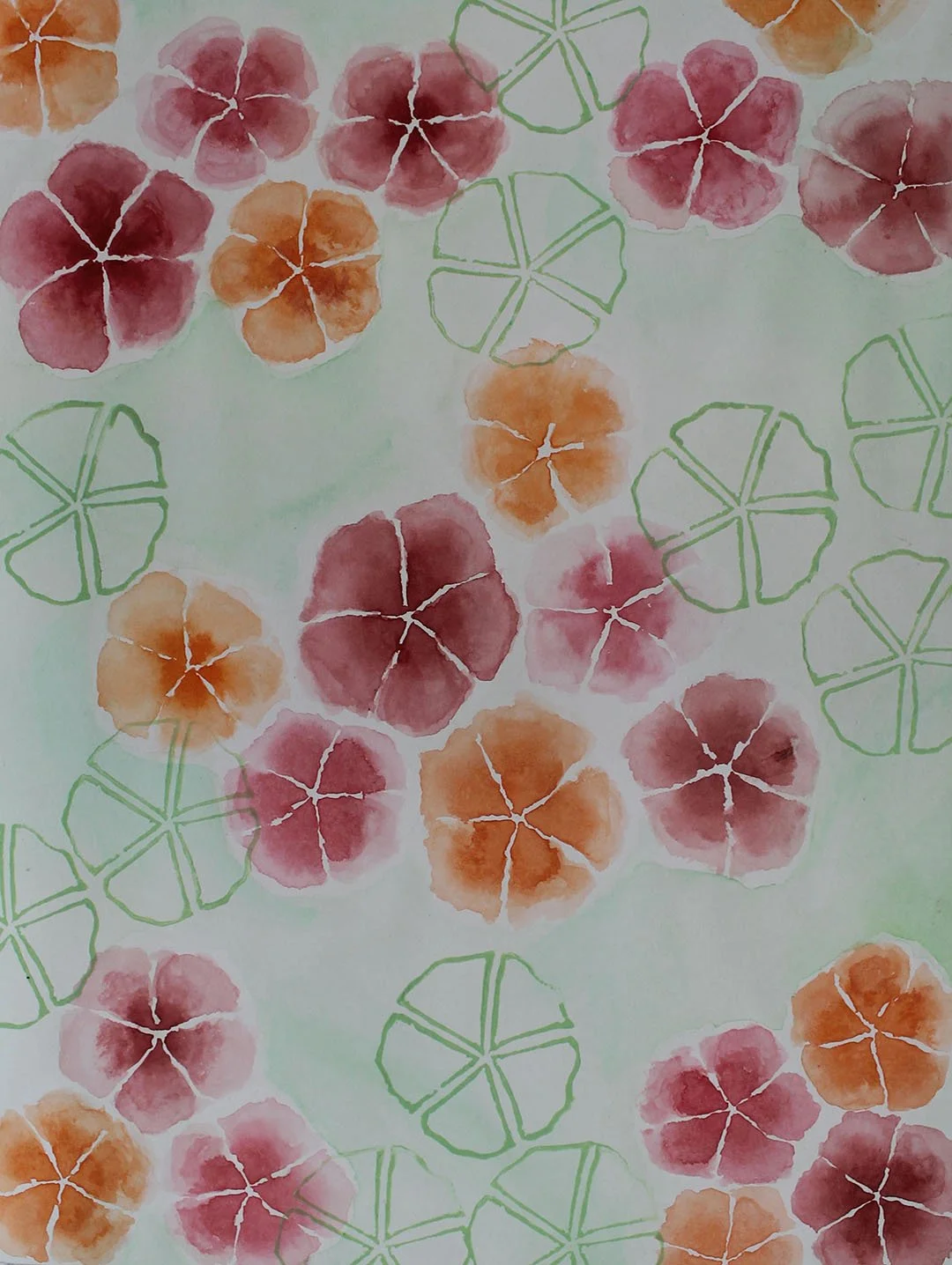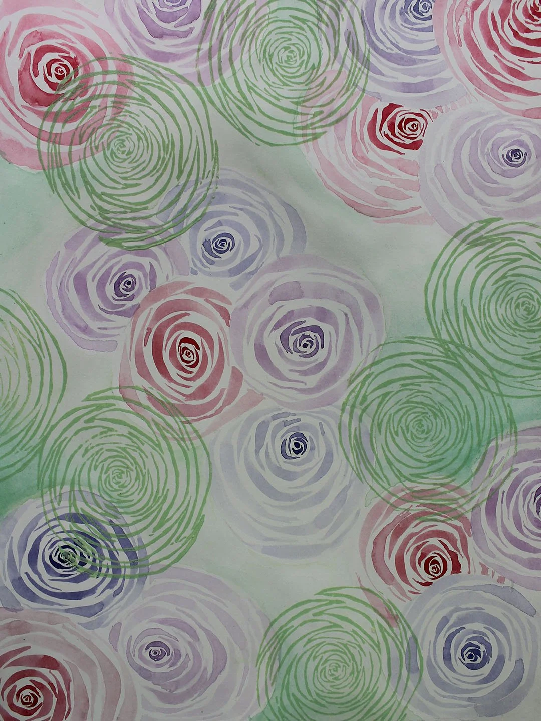 For my final series, I created mixed media artworks using watercolour paint and lino prints. My intention was to explore and celebrate the beauty of the natural world around us, focusing particularly on flowers and flowing organic forms. Throughout my work, I aimed to capture the delicate yet vibrant qualities of nature. To achieve this, I combined bright colours, organic shapes, and expressive line work. These elements allowed me to communicate the joy and happiness I feel when surrounded by nature, while also evoking similar emotions in the viewer. The inspiration for my finals came largely from my own backyard, which is filled with a wide variety of flowers, as well as from other gardens and natural environments that I visited. Drawing on these sources enabled me to incorporate personal and authentic details into my artwork, but it also allowed me to feel personally connected to my mixed media works after they had been completed. Overall, my aim was to not only share the happiness that I experience when surrounded by nature with those who view the artworks, but to also encourage audience members to notice, celebrate and connect with the beauty that exists around us in our everyday life.