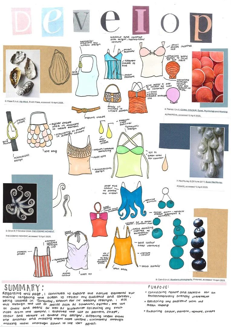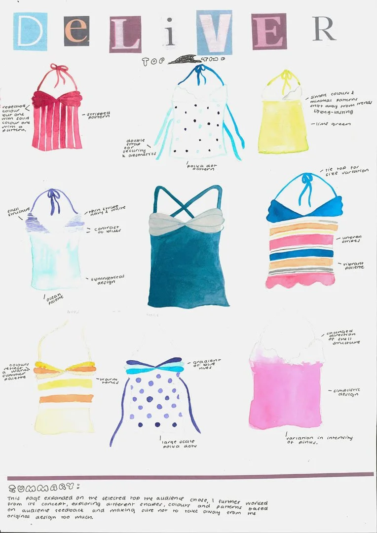 Complementing the poster is a line of three summer tops produced from repurposed and sustainable materials reinforcing the circular design aspect. I Incorporated ocean-inspired colours, shell-like shapes and fish-scale sequins to reflect the coastal lifestyle of Torquay while appealing to young women aged 15–20. These designs use flattering proportions, vibrant palettes, and natural textures to capture audience preferences while embedding sustainable values. The ideas were created through the use of watercolour paint media, but were refined to be produced physically using repurposed textile materials, sourced from op shops and unwanted garments.