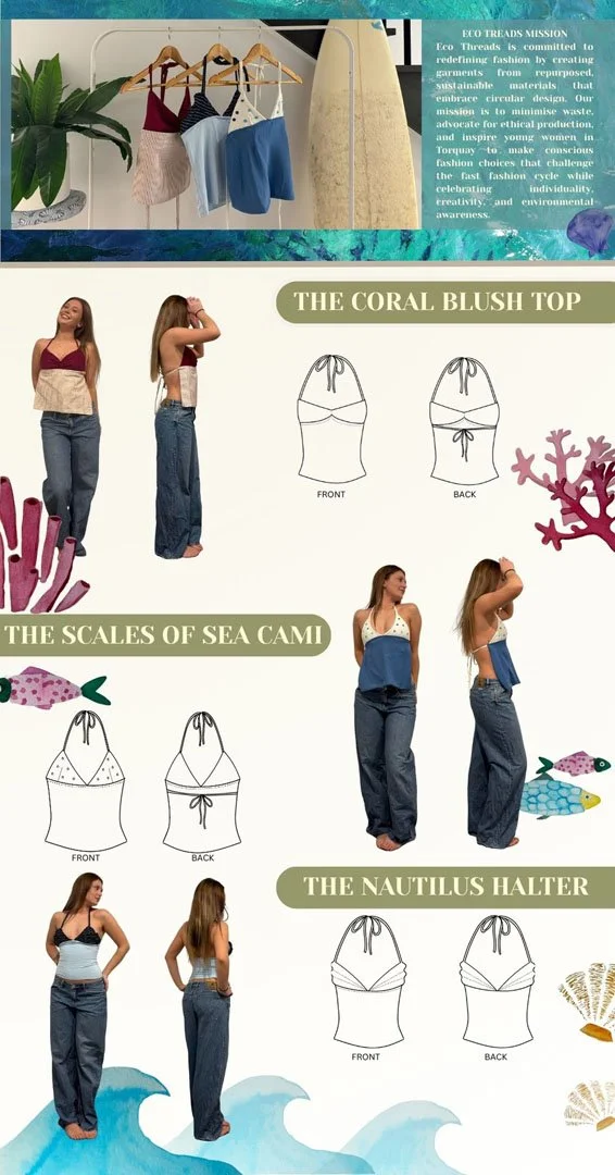 EcoThreads is a sustainable fashion brand located in Torquay, committed to circular design and promoting environmental awareness, targeted at 15-20 year old girls interested in the beach lifestyle, fashion and who have a vague understanding of fast fashion. Recognizing rising fast fashion concerns, the designs focus on promoting slow fashion and reducing global impact, most prominently on the environment and society.