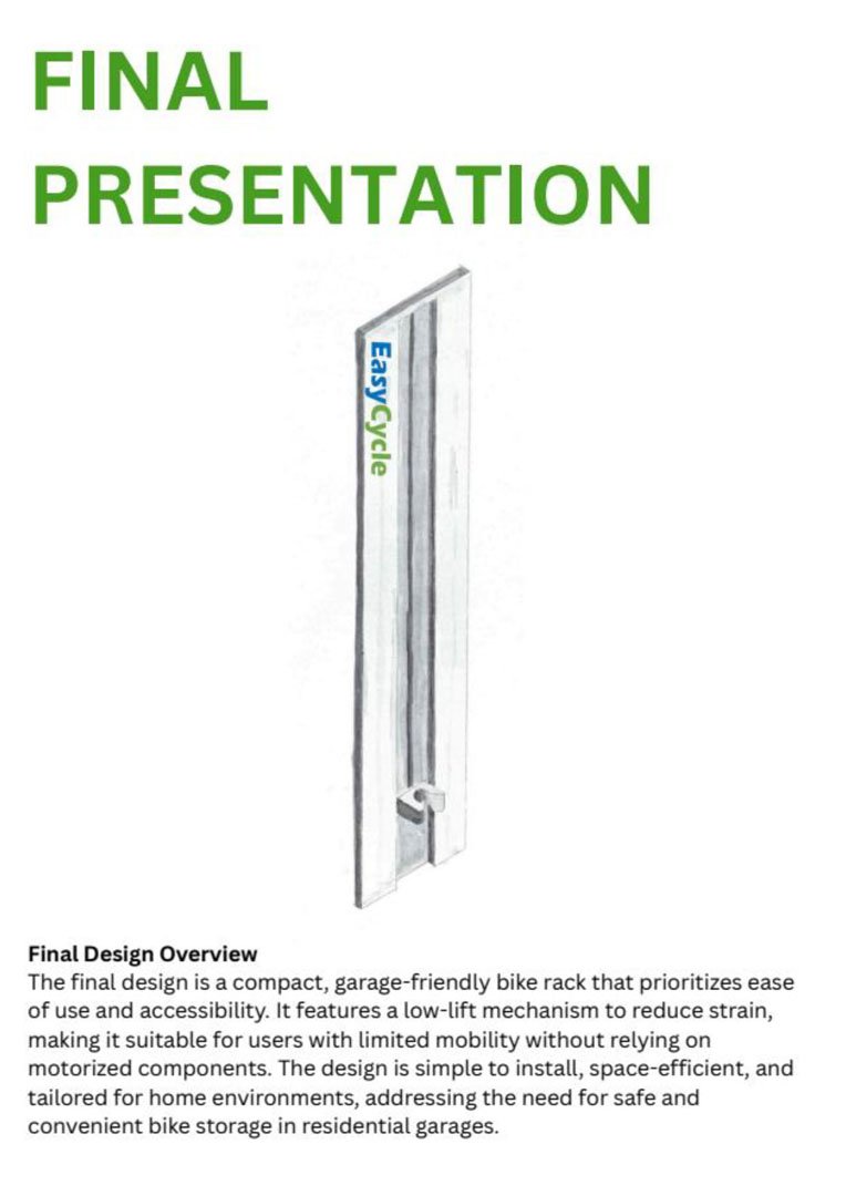 EasyCycle required the design of an indoor bike storage solution and a complementary design to promote cycling. They wanted a product that could be used by people of all abilities, including those with limited mobility, and a design that encourages cycling as a sustainable transport option.